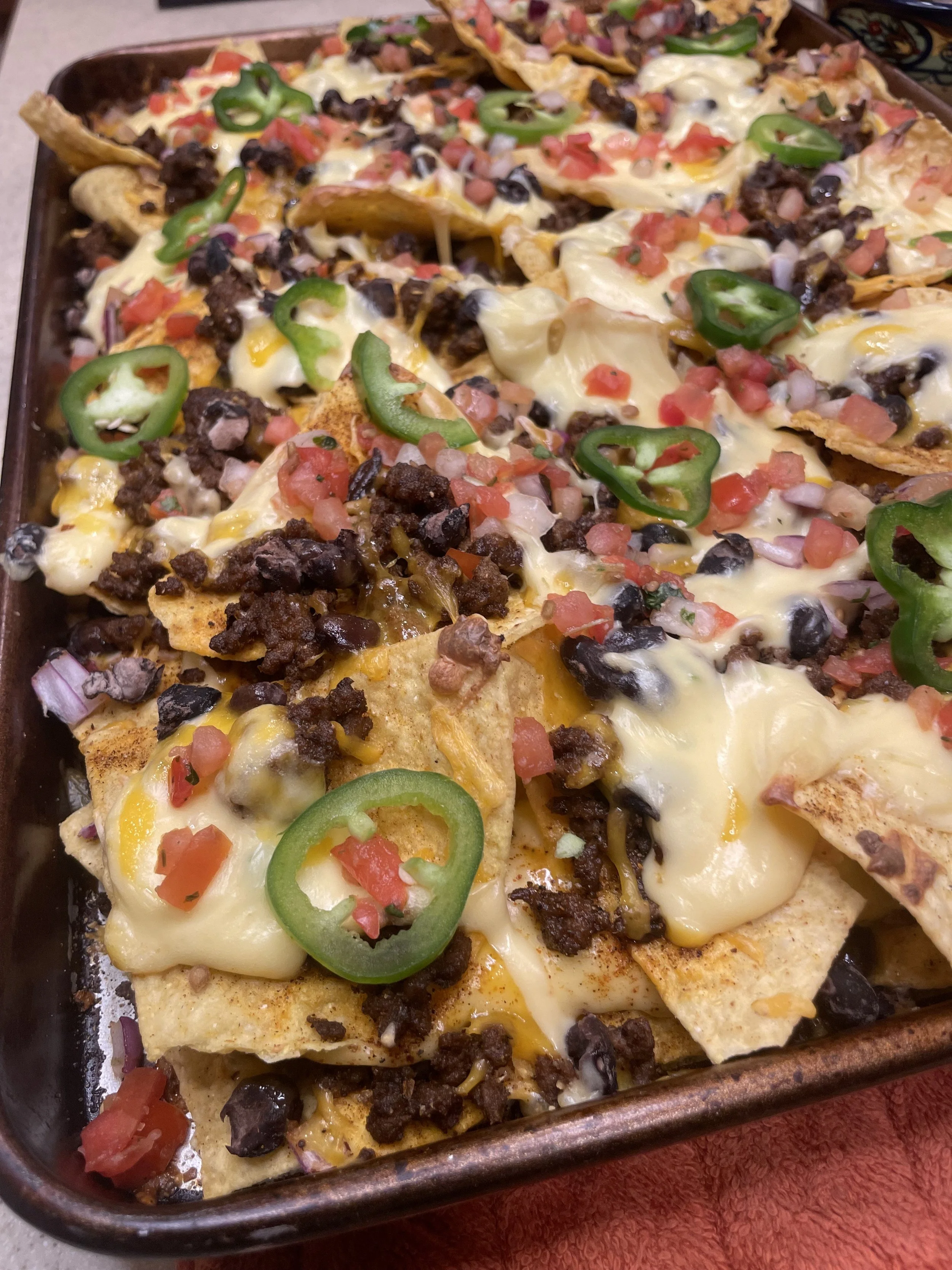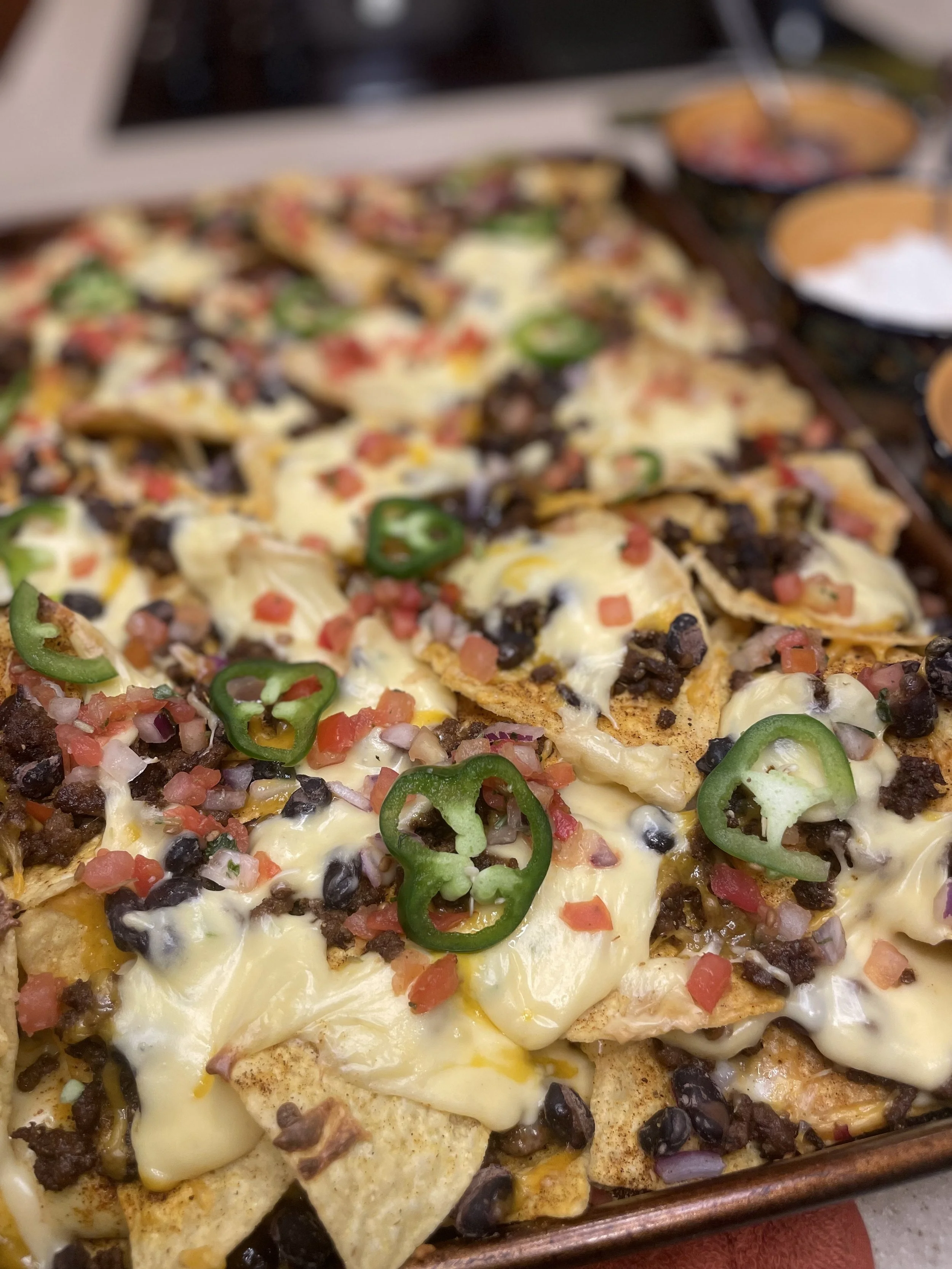2.) Spread first layer of chips onto a large sheet pan. (Flip them curvy side down, so they hold as many toppings as possible.) Sprinkle chips liberally with taco seasoning. Sprinkle on seasoned beef, then the black beans, and red onions as desired. Sprinkle liberally with cheese. Reserve enough ingredients to repeat the 2nd layer. You won’t use all of your chips.
